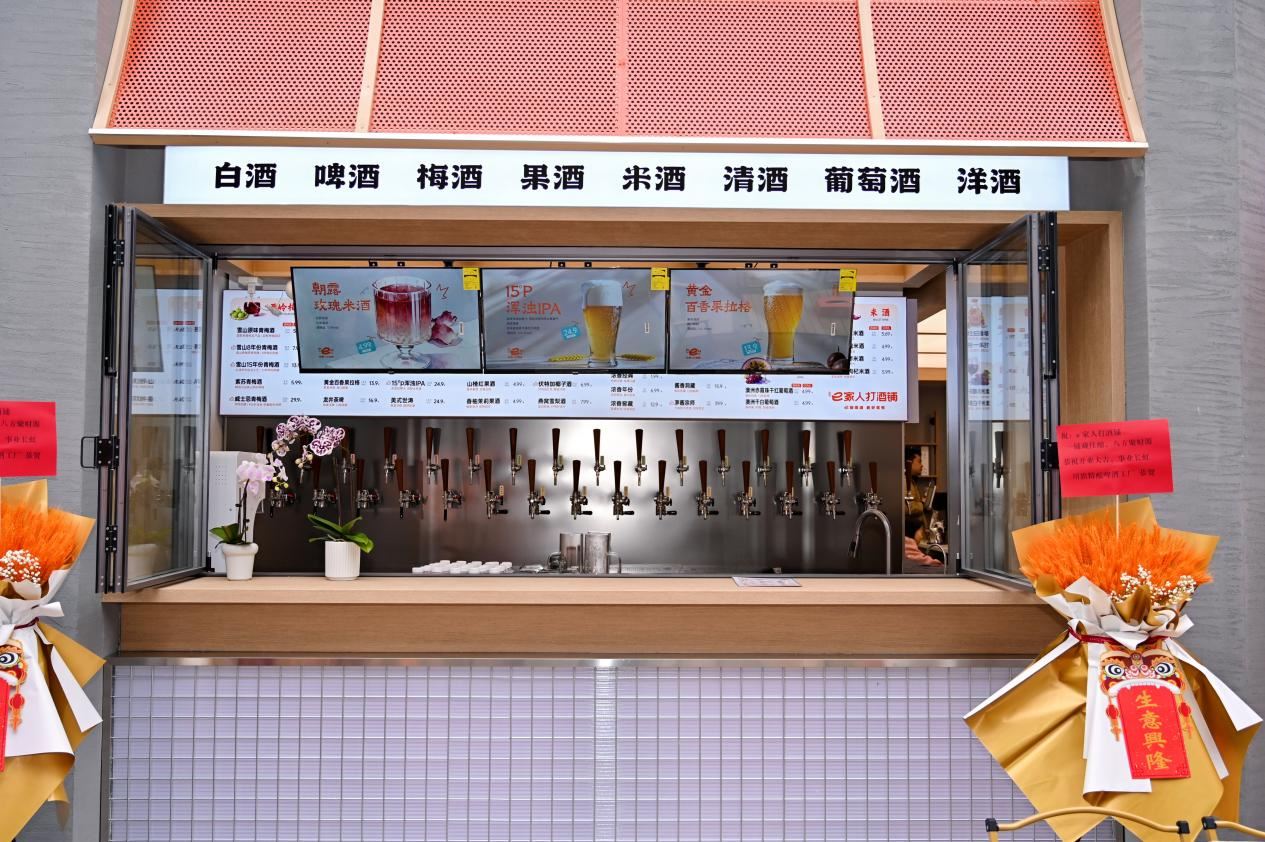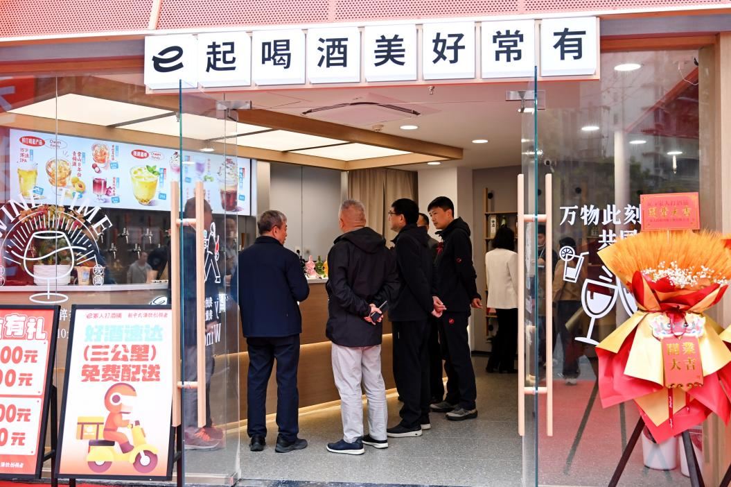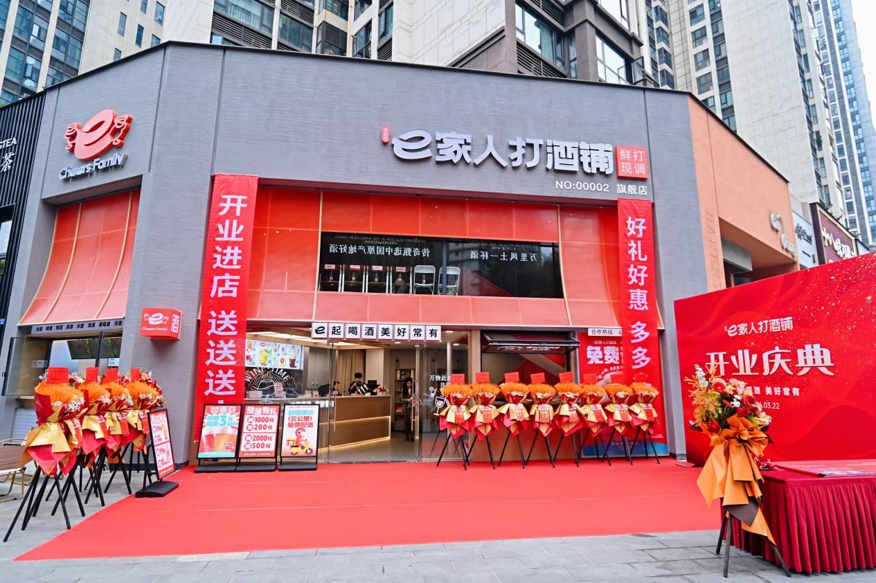 開業(yè)當天,四川恒輝金融、子竹資本、中國工商銀行、廣發(fā)銀行、宜賓市商業(yè)銀行等多家投行與金融機構高層也現(xiàn)身活動現(xiàn)場。恒輝金融負責人湯迪表示,之所以從眾多打酒鋪中選擇e家人,一方面在于e家人所展現(xiàn)出來的“家國”情懷。e家人旗艦店的設計中有個“屋檐”的小巧思,這是中國文化中最質樸的“家”的符號——走進e家人,就是一家人。店內隨處可見“e起喝酒,美好常有”的品牌口號,50款酒占據兩面打酒墻,涵蓋了白酒、啤酒、米酒、果酒、洋酒、葡萄酒等酒種,此外還有e家人獨家推出的6款現(xiàn)調系列,總共56款——e家人的選品理念是“傳奇甄選中國原產地好酒”,56這個數字也是為了致敬中國56個民族,以極致中國風味,讓天下人共享美酒好生活。