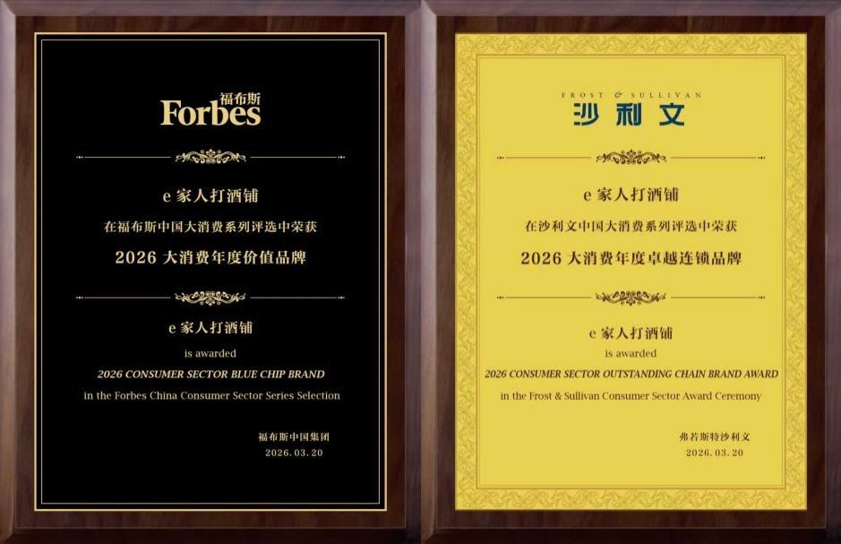 就在前兩天,e家人打酒鋪再傳捷報。在剛揭曉的福布斯中國大消費年度評選和沙利文中國大消費年度評選中,分別榮獲福布斯2026大消費年度價值品牌、沙利文2026大消費年度卓越連鎖品牌。